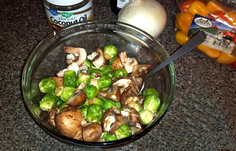 Add the balsamic vinegar, coconut oil (may need to be warmed up to turn liquid), salt and pepper. Mix thoroughly until the sprouts are saturated in the balsamic mixture.