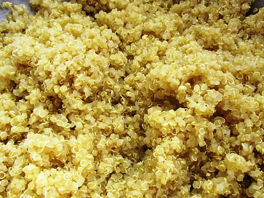 The first step is to cook the quinoa, which is very simple, as it is cooked just like rice. You will add 2 cups water to 1 cup quinoa. Put 2 cups water in a pot, rinse the quinoa, then add it to the water. Cook on high until water starts boiling, then set it on low until the water has evaporated and the quinoa is cooked. You will know when it is done when you see little sprout tails coming out of the quinoa grains: