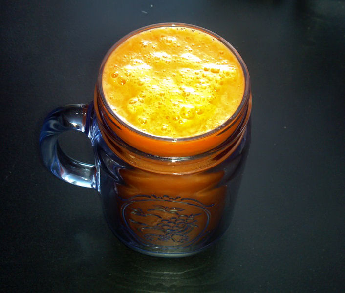 Begin by cutting up the fruit and carrots, and place them in the blender. Add the coconut water on top, and blend until smooth and creamy: