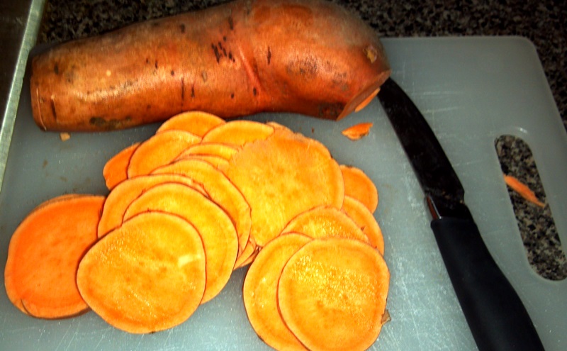 Thinly slice the sweet potatoes. Remember, the thinner the more crispy. The thicker, the more chewy: