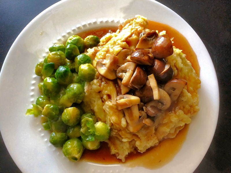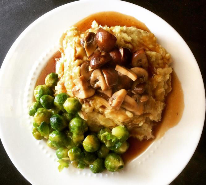Once the potatoes are mashed, put them on a plate and top with your mushroom gravy sauce. Serve with a side of steamed brussels sprouts as picture, or carrots, peas, corn, whatever you wish!