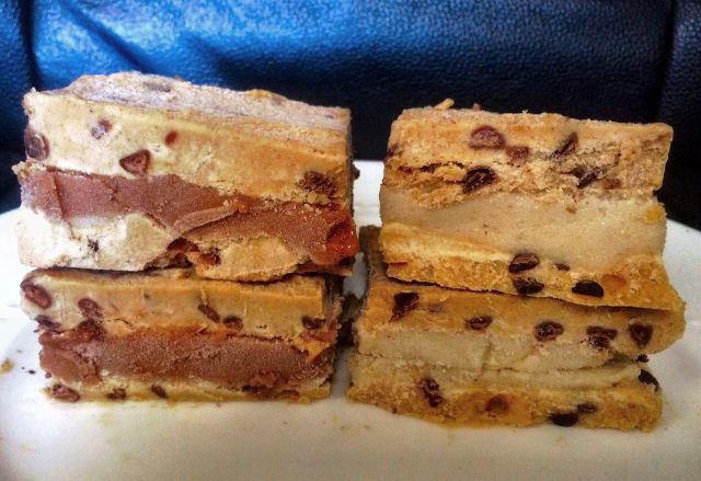 Vanilla and chocolate ice cream , with chocolate chip cookie dough sandwiches!