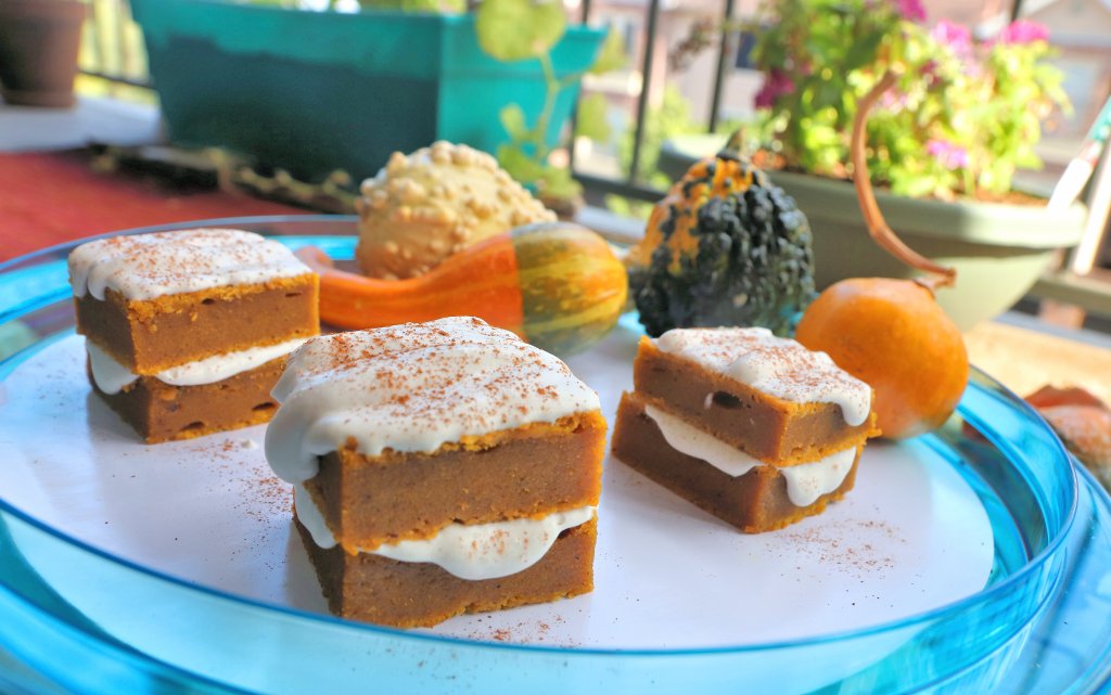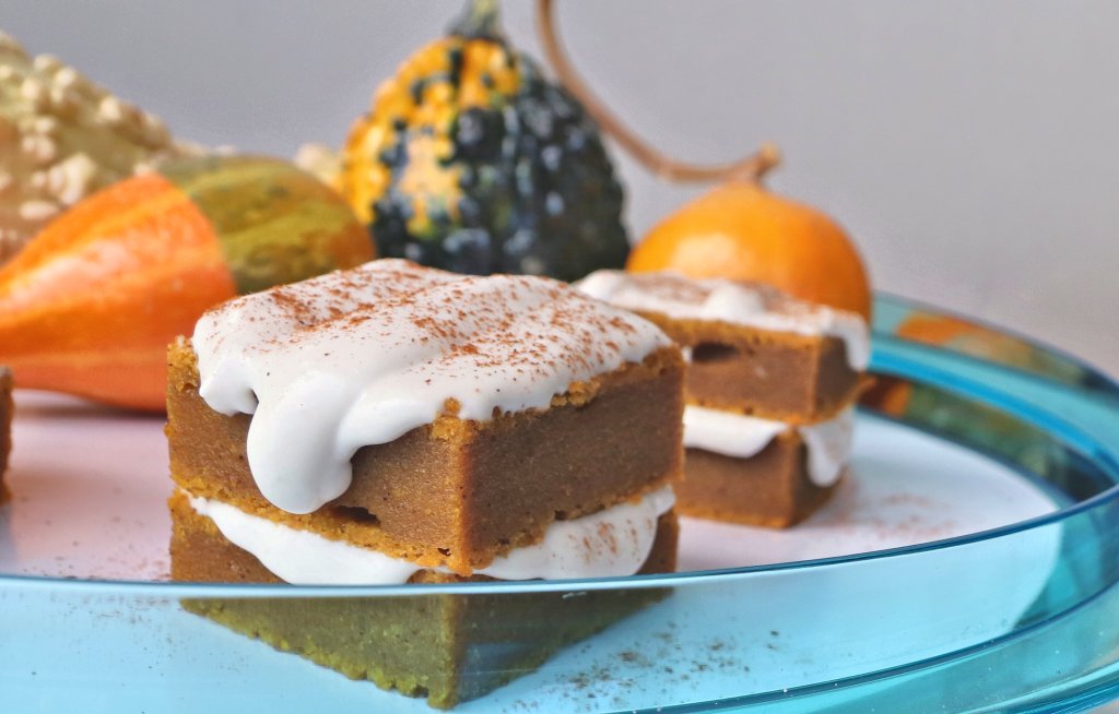 After the bars have cooked set aside to cool. Once they are cool, slice into equal square parts, about 1 to 2 inches in diameter. Spread a generous layer of the coconut cream on top of a bar, and place another bar on top of that. Finish with a second layer of coconut cream and a sprinkle of pumpkin pie spice.