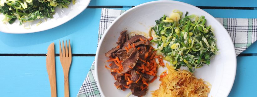 Thinly slice the heart and add to a large skillet with the tablespoon of coconut oil, Worcestershire sauce, thyme, and the garlic. Cook on medium heat until the heart is no longer pink, but don’t overcook to where it looks rubbery. A taste test may do well here to make sure you are no overcooking the heart.