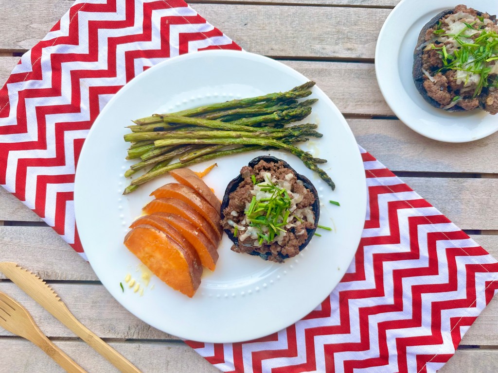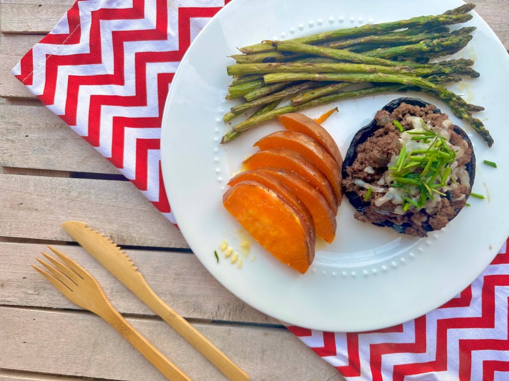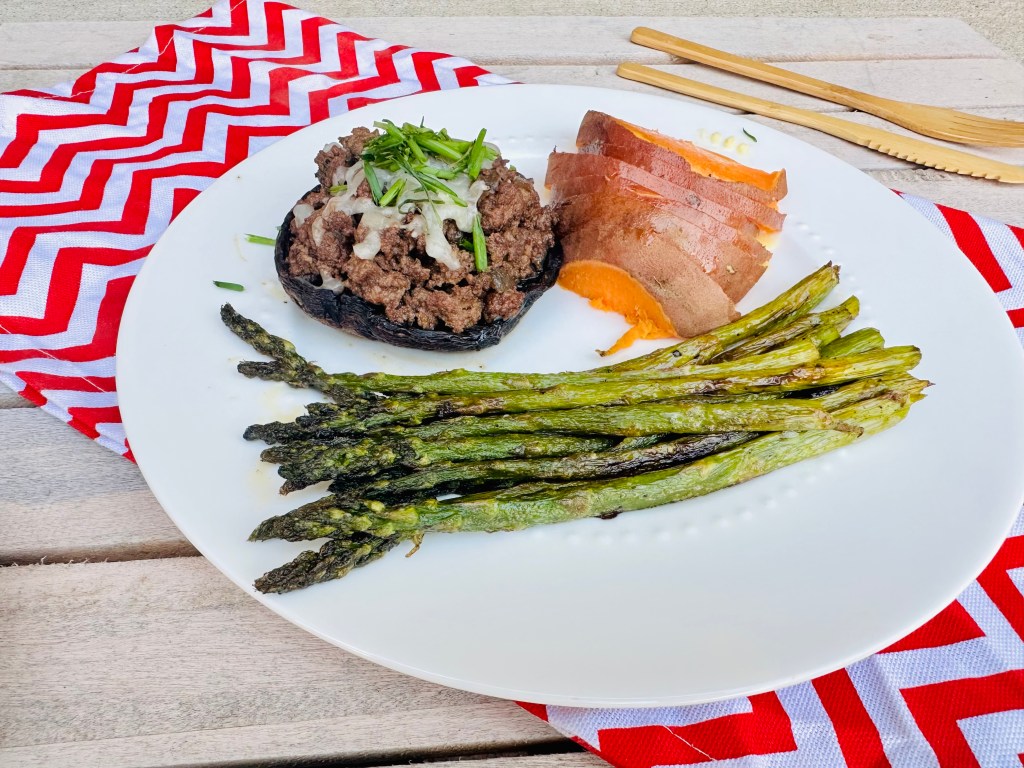 When they are done, plate the dish with a stuffed mushroom on each plate, and sprinkle the fresh chives on top. Add either some slices of sweet potato or a whole potato on the side with a big of asparagus.