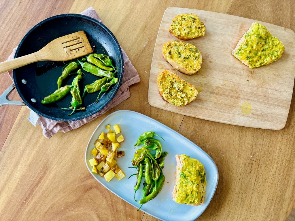 Cook the shishito peppers with 1 tbsp olive oil, 1 tbspo butter, and salt on medium high heat until there is a bit of sear on them. When they look seared, remove from heat