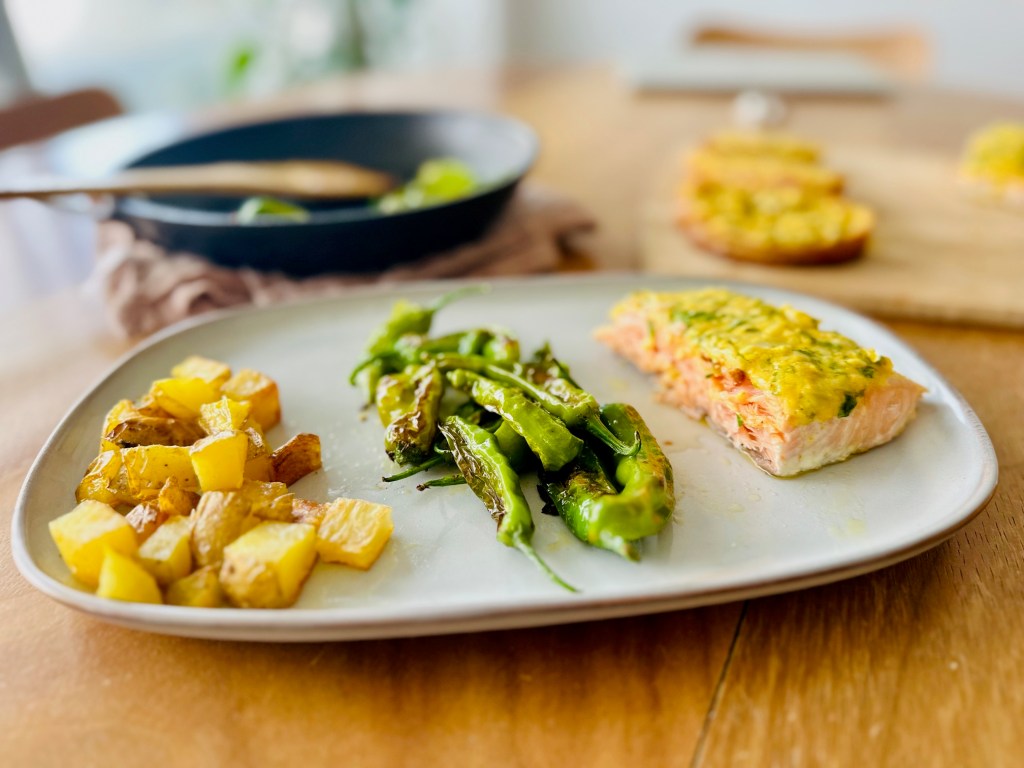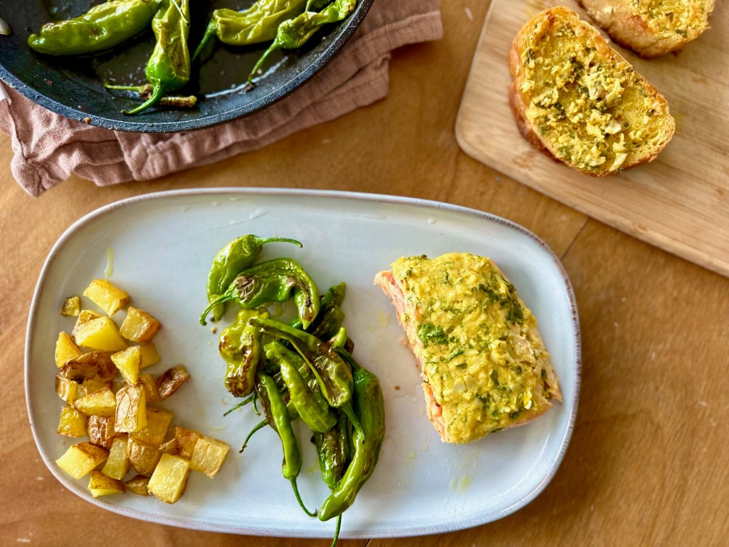 This recipe is so easy to make, and you can really pair it with anything. I just happened to have shishito peppers and toast in my fridge, so I used that along with some potatoes. But feel free to serve the salmon with anything.