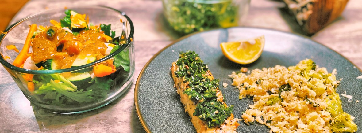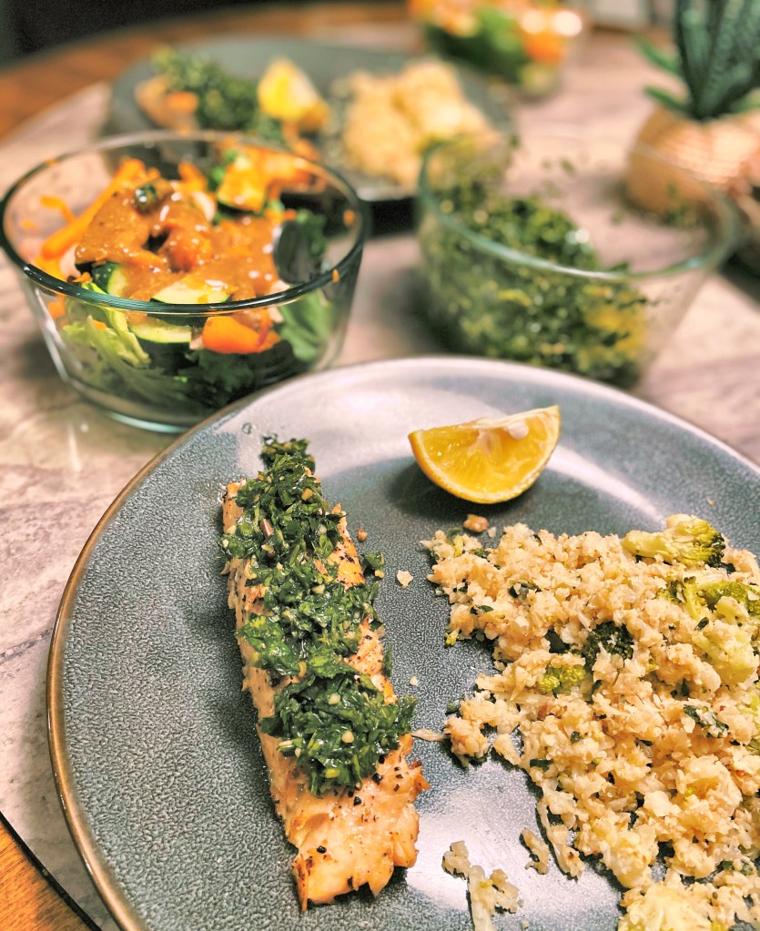 The ingredients are simple, no fancy sides and you can buy pre-packaged salads and frozen cauliflower. Most of the work is in the mint chimichurri sauce and cooking the salmon, so focus on that, the rest is just side stuff.