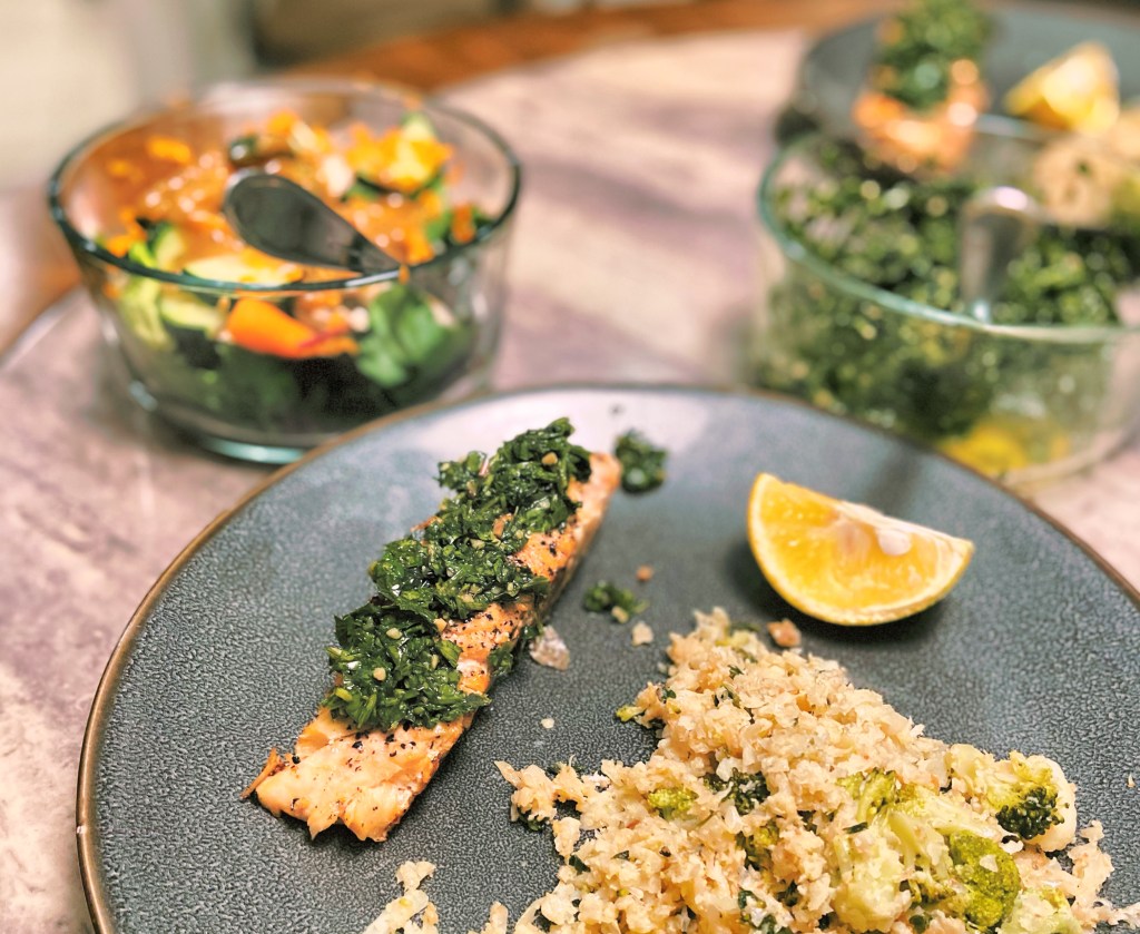Plate the salmon, cauliflower rice and salad. Add the mint chimichurri generously on top of the salmon.