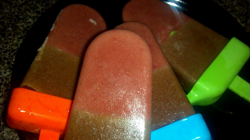 Mix until creamy, then spoon the mixture into the popsicle molds, and place in freezer. If you are using long wooden popsicle sticks, be sure to have them in place in the middle of the mixture so that they will be ready for the next layer!