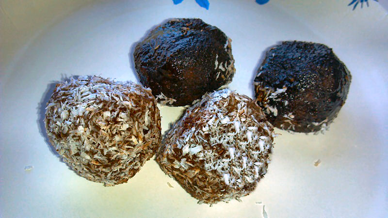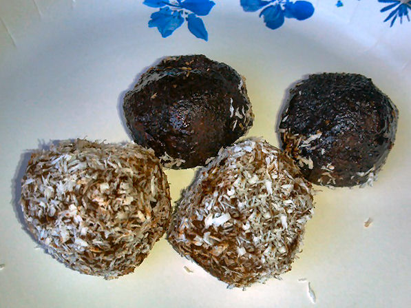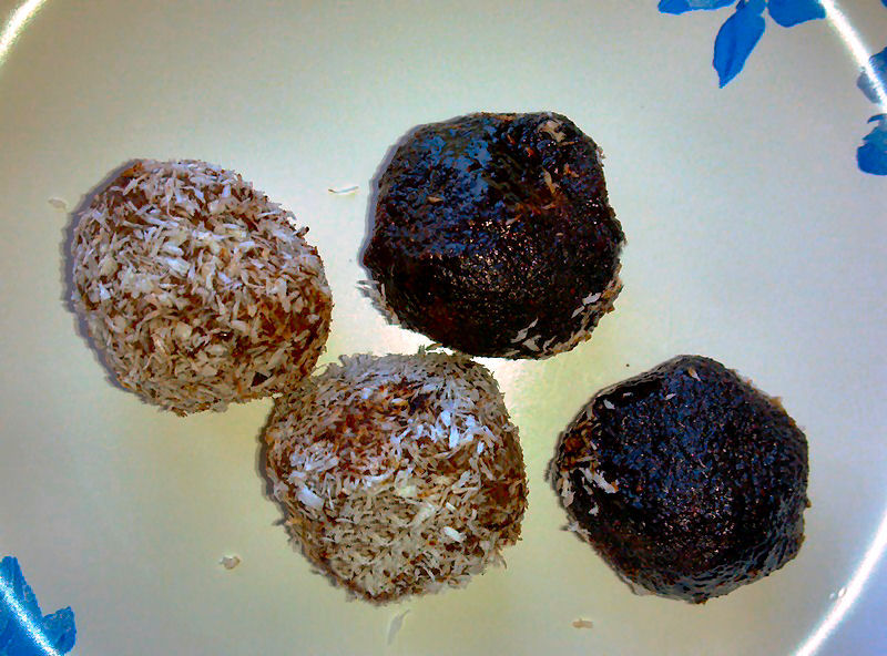 Voila! Done! Now all we need to do is form the balls, and put them in the freezer to harden. Form the balls into about 1 or 2 inch bite size pieces and then roll them in some shredded coconut and carob powder. I mixed 1 tbsp. coconut sugar with 1/2 tbsp. carob powder for a truffle look, as well as rolled some in shredded coconut.