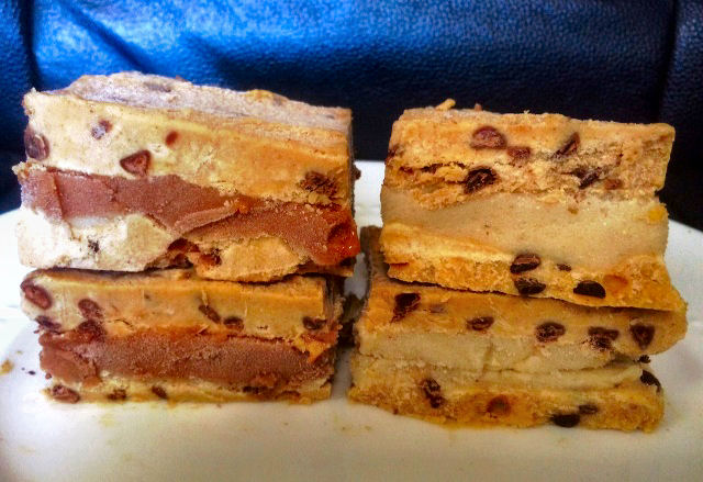 Ever want some ice cream sandwiches, but without the fat, chemicals and processed ingredients that the sandwiches are packed with? Or how about the articles that came out last year about Walmart’s ice cream sandwiches that won’t melt…even if left out overnight in 80 degree heat? (See this article to read the story!) Who wants to eat and ice cream sandwich that won’t melt? Not me! So I came with my own recipe. This is vegan, dairy free, and so simple to make. It even gives you some extra protein from my chickpea cookie dough!