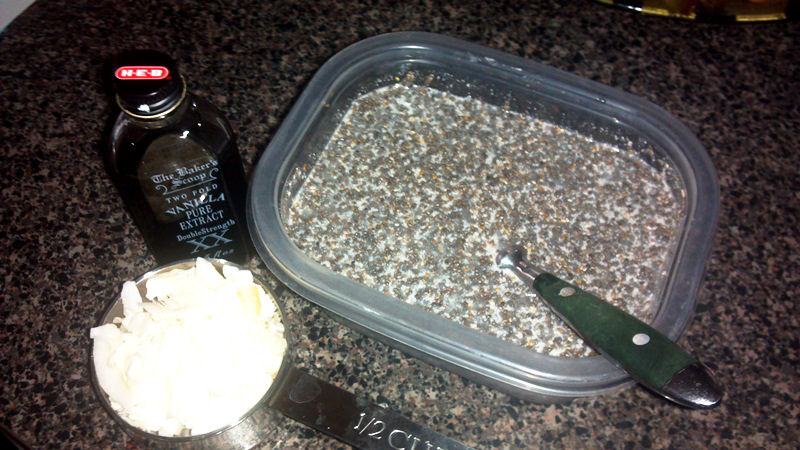 Put the mix into a container and store in the refrigerator, either overnight or for about 8 hours. Take out the mix and stir it with a fork every so often. This helps the chia seeds to fully mix into the pudding.