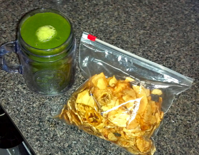 Once finished, eat at once, or store in zip lock or airtight bags. I like to eat mine with a mixture of other banana chips and a green smoothie, as picture below. Snack perfection!