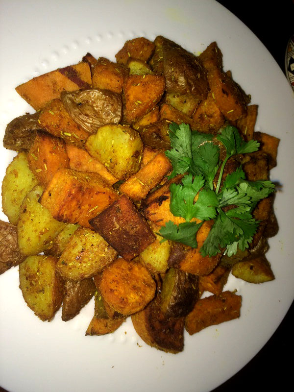 Melt the coconut oil, then add the rest of the ingredients to the pan. Pour this mixture over the potatoes and mix together, making sure the potatoes are fully coated.