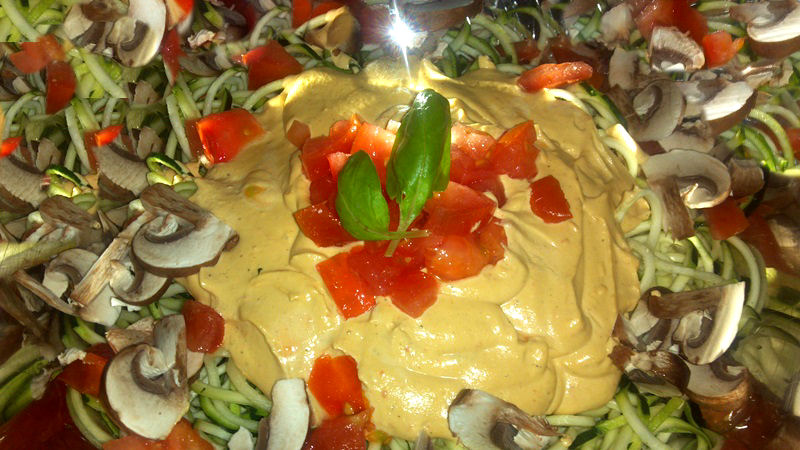 Spiralize the zucchinis and slice the rest of the ingredients. Arrange in the large bowl, and start spooning on the cheese sauce! Your dish should look something like this: