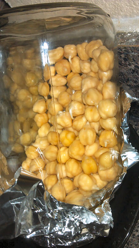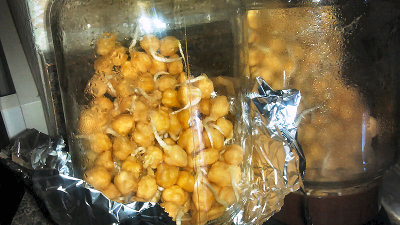 4) In the morning, you should notice that the chickpeas expanded a ton. This is a good thing. Rise out the chickpeas, put them back in the jar, and cover with your tops. Lean them up against the wall at an angle, making sure the chickpeas are dispersed and not all bunched up at the bottom.