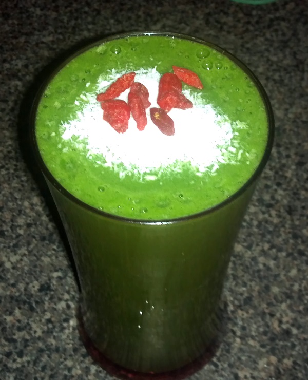 Blend together until thoroughly mixed and creamy. IF you need more liquid, add more water or coconut water. Top with dried berries, shredded coconut or fresh peaches, and drink up!