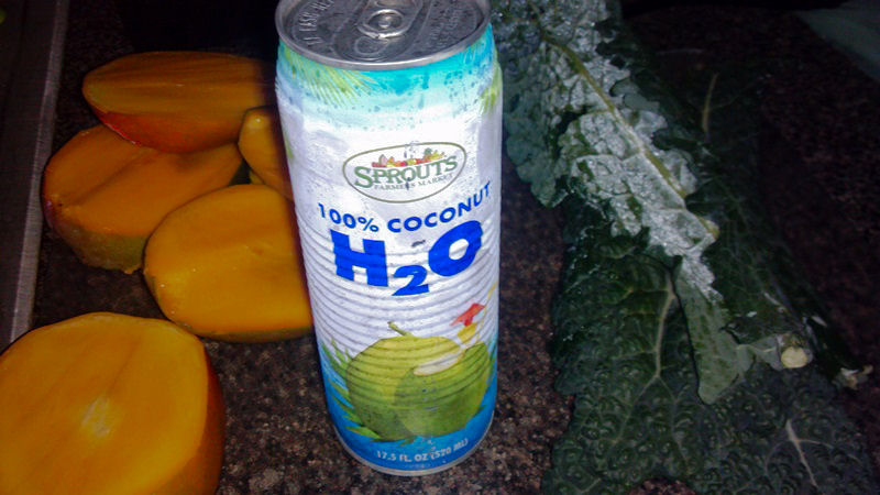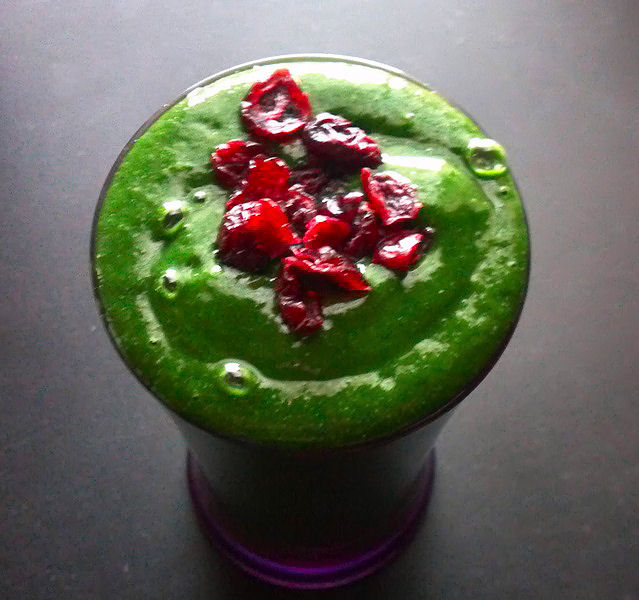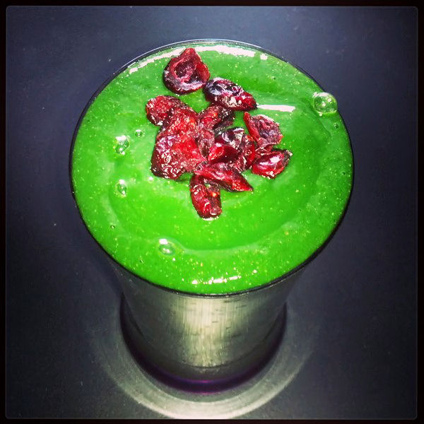 Add your mangos in the blender, then the coconut water, the kale and your additional superfood ingredients. Blend on high until thick and creamy. Pour into a glass, top with dried berries such as gogi, blue berries or cranberries (pictured) and drink up!