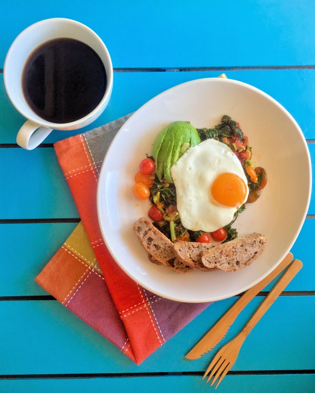 This recipe is really simple, with an easy veggie base that can be topped with a fried egg, scrambled together like a hash, or topped with just plain boiled eggs. You can also use this whole recipe as a breakfast taco and wrap it all up in a tortilla! As usual, I encourage you to be creative with my recipes, as I am with others 🙂
